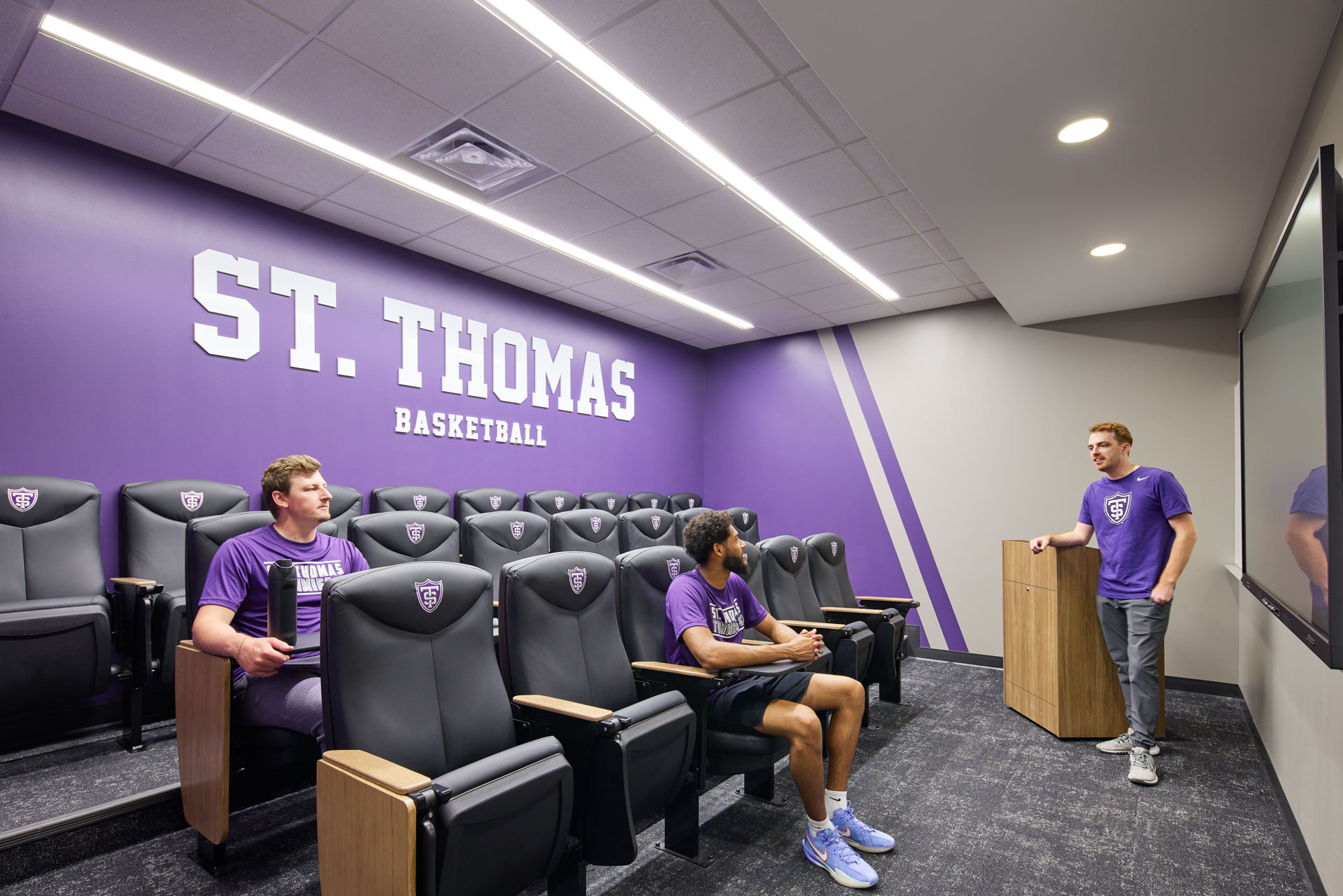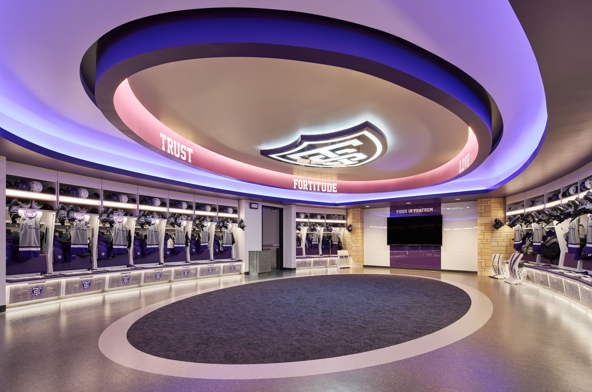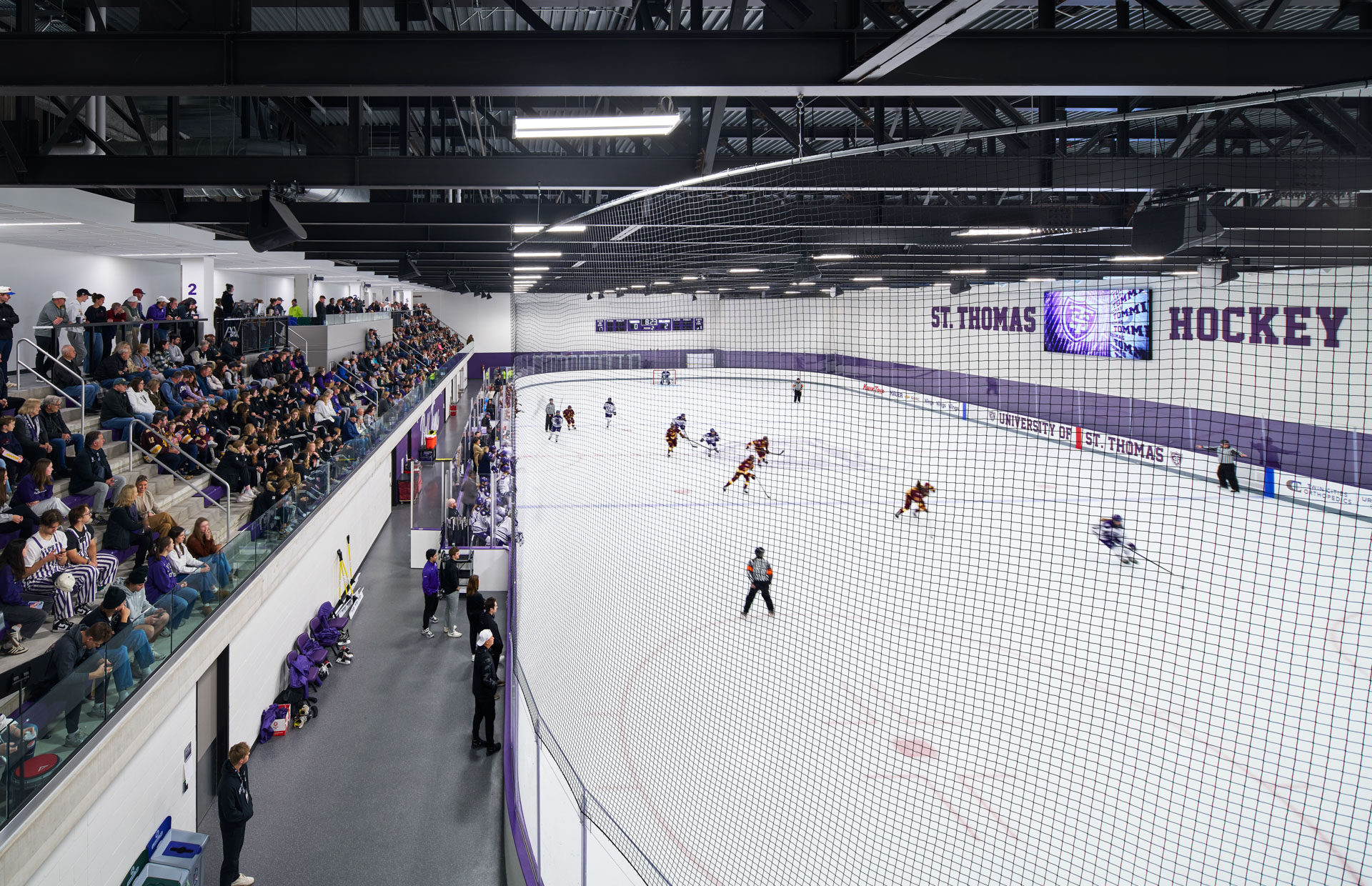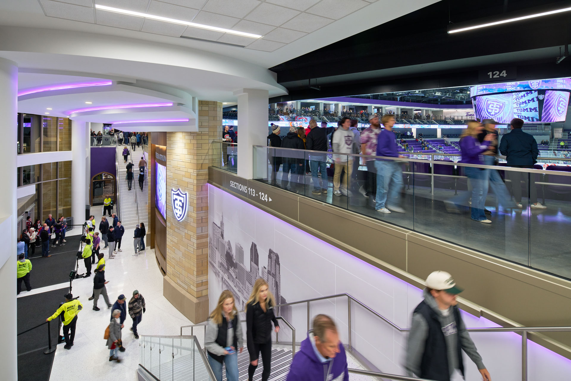 The arena includes 6,200 seats for men’s and women’s basketball, 5,000 for men’s and women’s hockey, and 6,500 for concerts. Fans enter at ground level into a grand lobby, which includes vertical circulation up to the concourse level. This lobby will also function as an event space, capable of hosting receptions and smaller gatherings. The seating bowl incorporates a mix of retractable, variable rise, and platform sections designed to optimize sight lines for both basketball and hockey. The objective was to give each sport the atmosphere of a dedicated, single-sport venue. The flexible seating layout also allows for quick changeovers to accommodate St. Thomas commencement ceremonies, academic convocations, guest speakers, career fairs, and other university and community events. At 250,000 square feet, the complex is more than just a state-of-the-art arena. Its east wing will serve as the hub for seven intercollegiate athletic programs. Tommie basketball, hockey, soccer, and softball will each have dedicated administrative offices and full team suites, along with facilities for training, rehabilitation, performance development, nutrition, academic support, and team meetings—all conveniently located near their home competition venues.