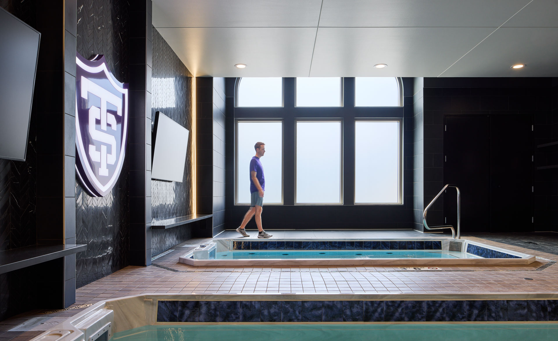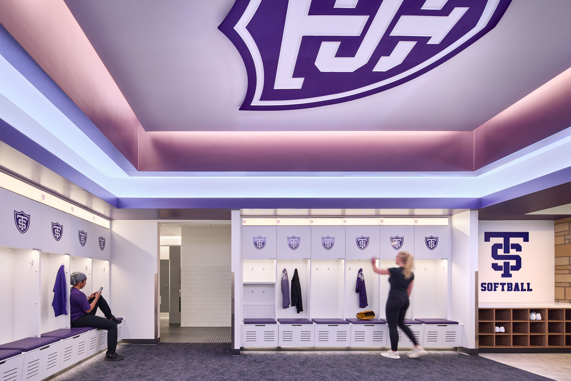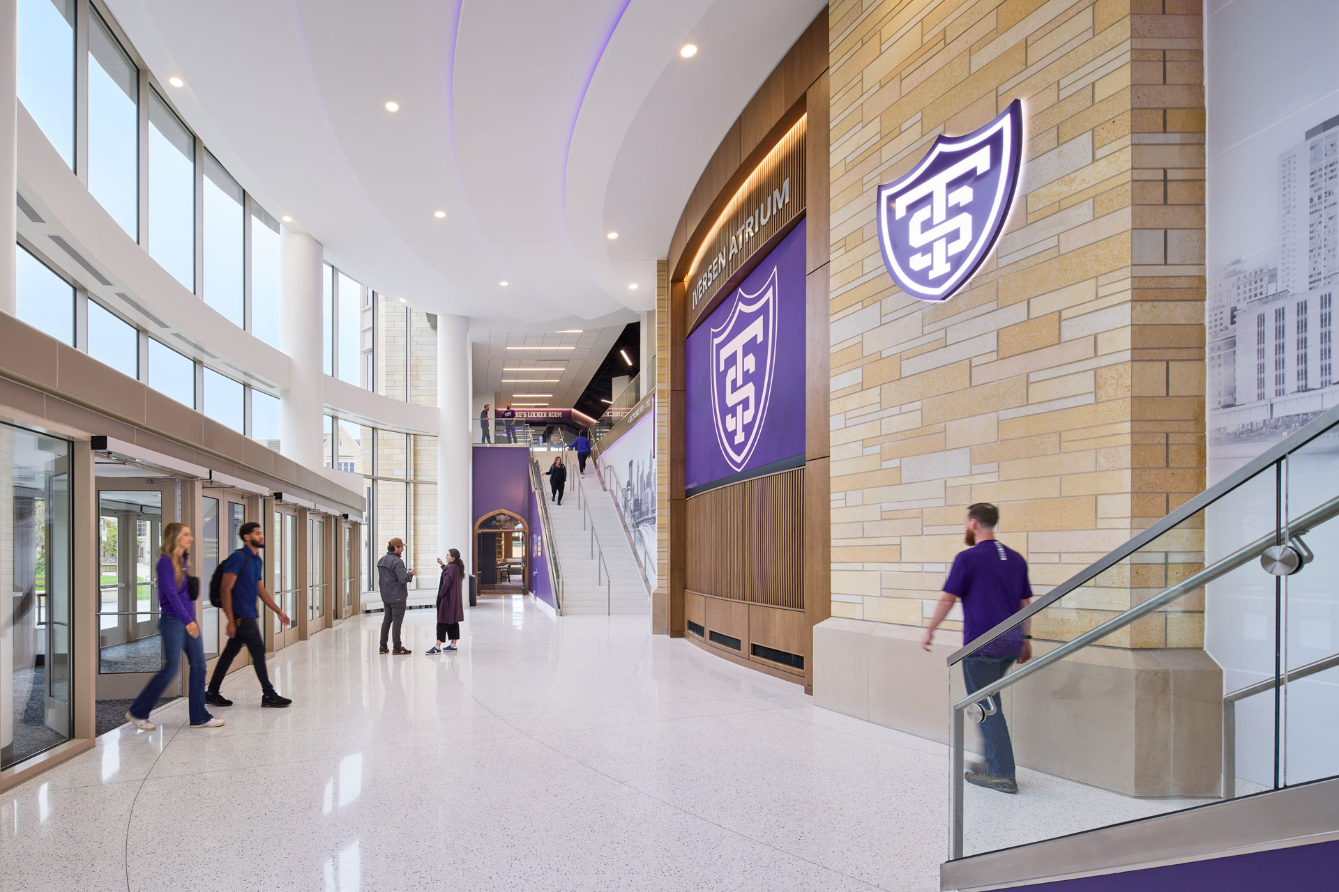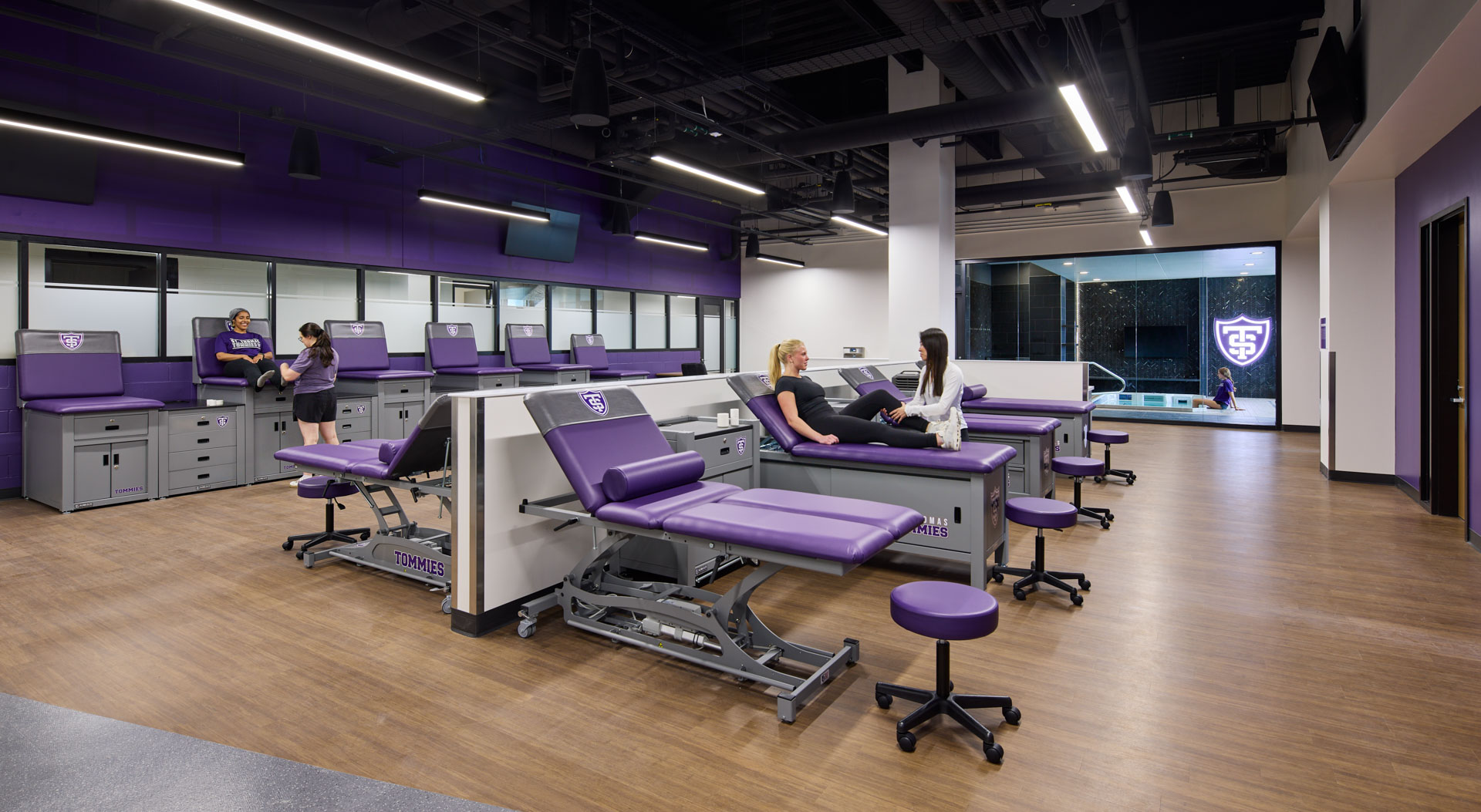 The arena includes 6,200 seats for men’s and women’s basketball, 5,000 for men’s and women’s hockey, and 6,500 for concerts. Fans enter at ground level into a grand lobby, which includes vertical circulation up to the concourse level. This lobby will also function as an event space, capable of hosting receptions and smaller gatherings. The seating bowl incorporates a mix of retractable, variable rise, and platform sections designed to optimize sight lines for both basketball and hockey. The objective was to give each sport the atmosphere of a dedicated, single-sport venue. The flexible seating layout also allows for quick changeovers to accommodate St. Thomas commencement ceremonies, academic convocations, guest speakers, career fairs, and other university and community events. At 250,000 square feet, the complex is more than just a state-of-the-art arena. Its east wing will serve as the hub for seven intercollegiate athletic programs. Tommie basketball, hockey, soccer, and softball will each have dedicated administrative offices and full team suites, along with facilities for training, rehabilitation, performance development, nutrition, academic support, and team meetings—all conveniently located near their home competition venues.